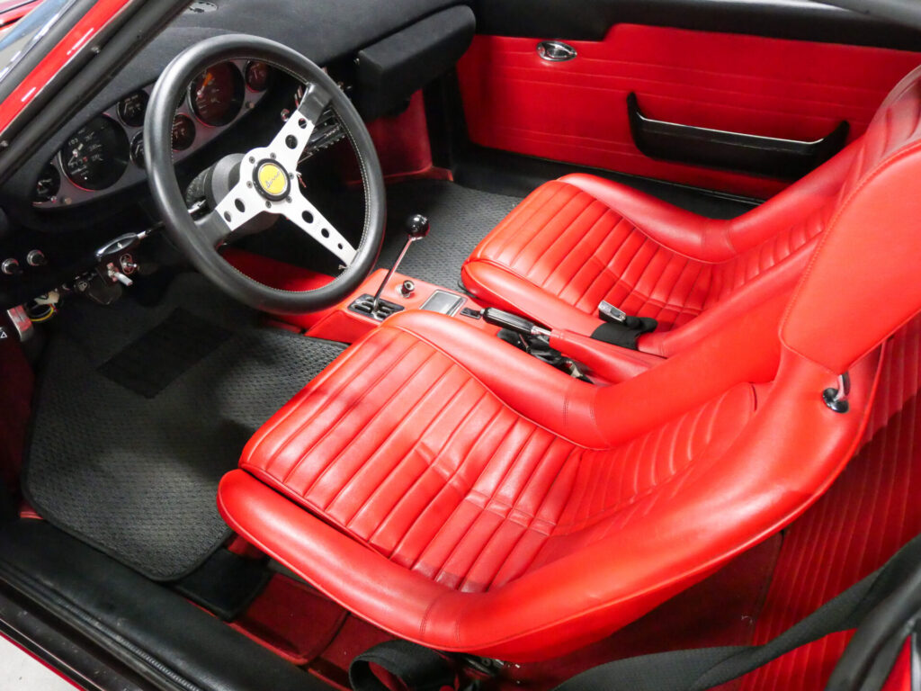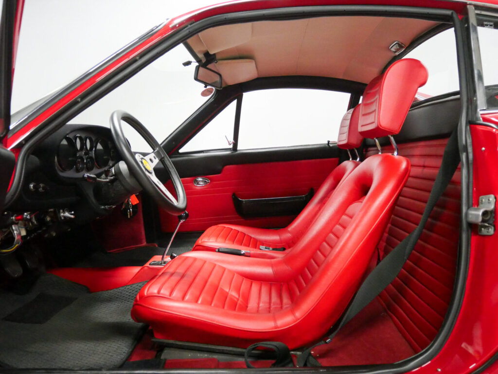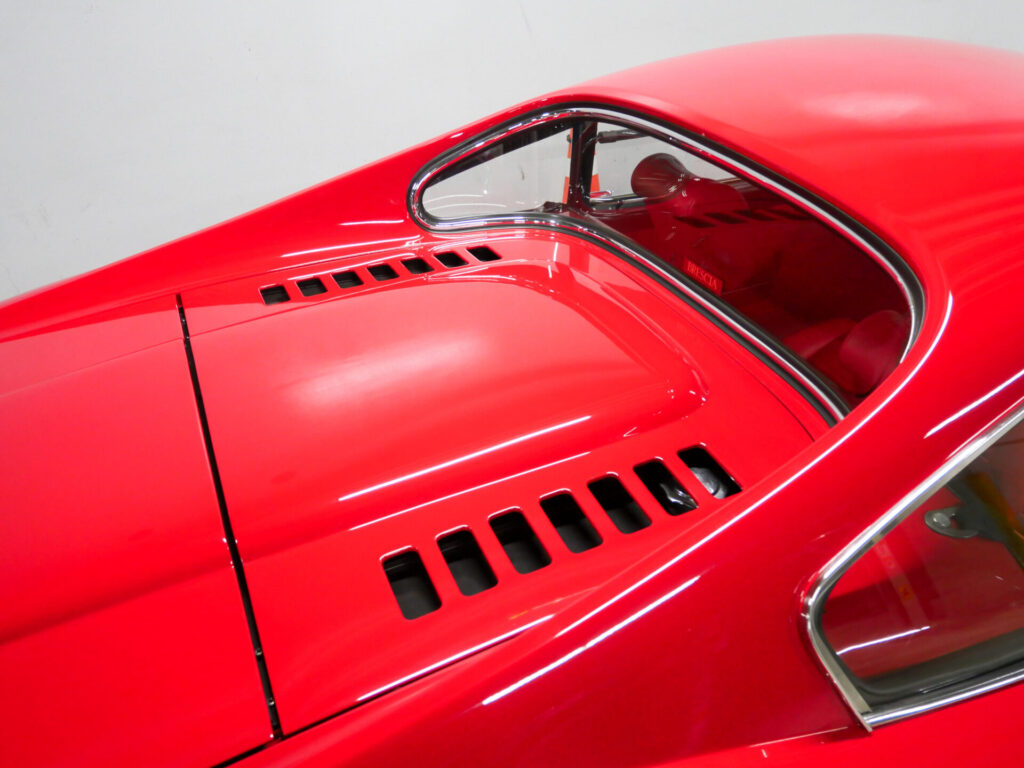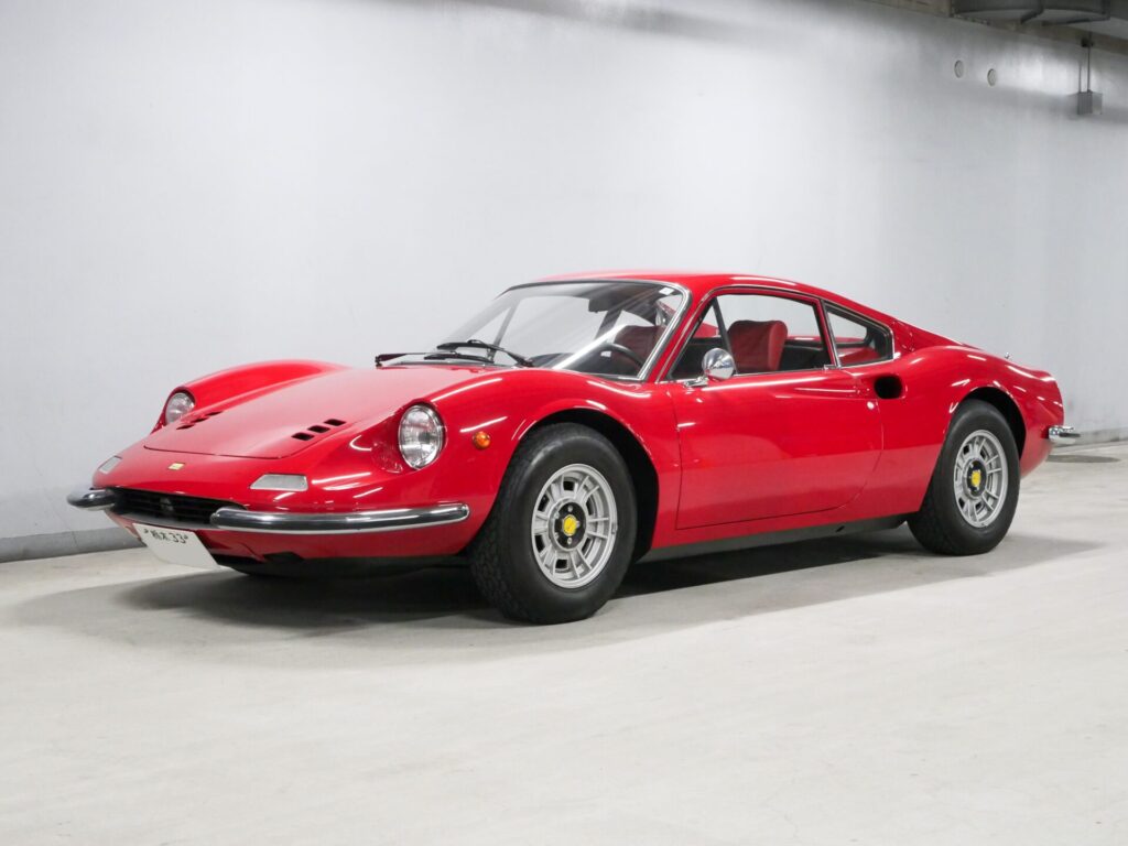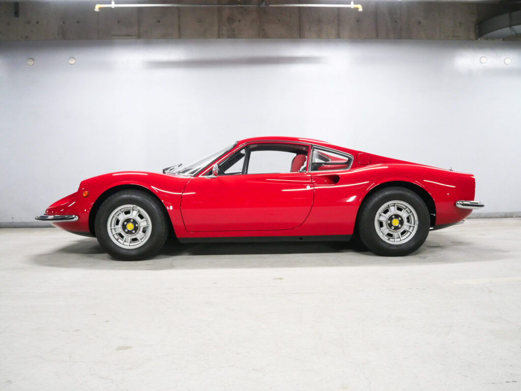 ディノ246GTは、1969 年にV6ミドシップの進化系として発表されました。 2.4 Lエンジン、デュアル・ヴェーバー DCNF/19 キャブレターを搭載し、195 CV の出力を発生。5 速トランスミッションは、ギア比が長く、ダッシュボードも再設計され、オプションのエアコンも装備可能となるなど、実用性が向上しました。1971年から1974年にかけて3,061台が生産されたシリーズEは、246GTの最終モデルで機械的に最も洗練されたといえるでしょう。